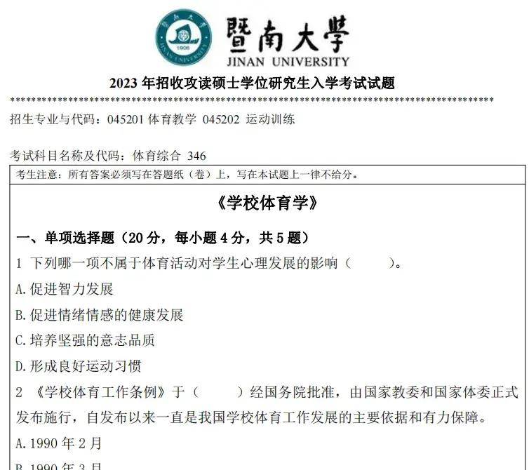 2023年暨南大学346体育综合考研真题试卷