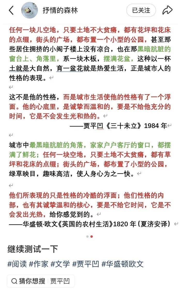 此前,“抒情的森林”还曾发帖指出,贾平凹发表于1990年的《美穴地》,与冰心《往事(二)》的第四篇有相似之处,但是此帖已被删除。一段时间以来,“抒情的森林”多次在社交网络上发帖,通过文字对比,指出一些作家在内容方面的“异曲同工”。前不久,86岁的老作家杨本芬就“袭用别人的语句”道歉。