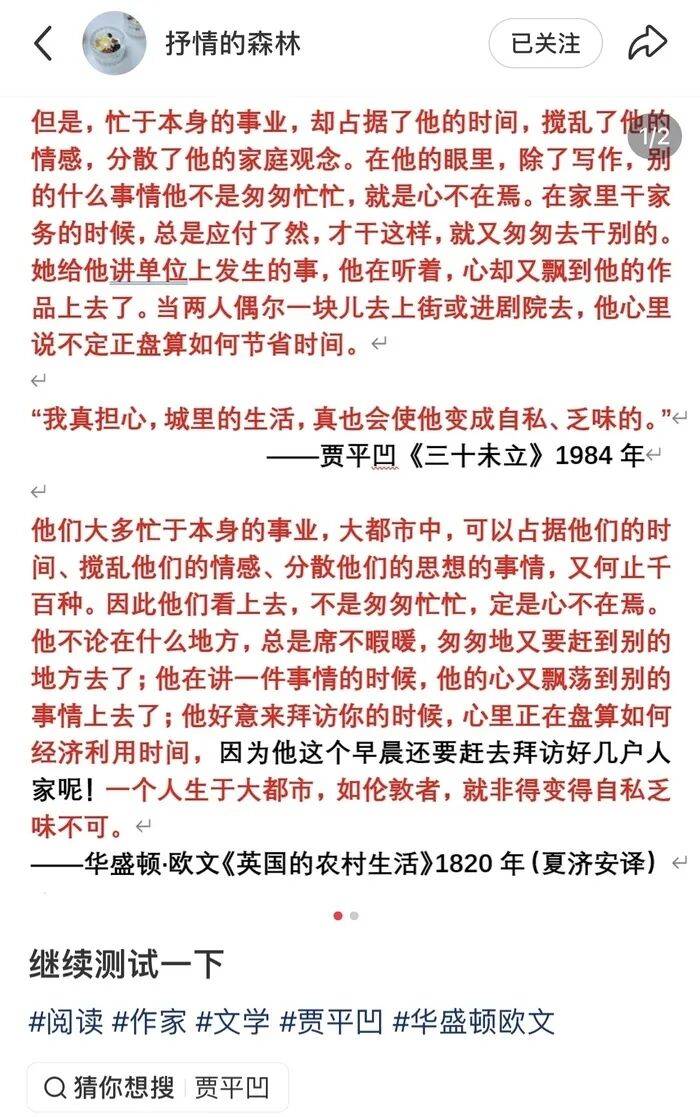 据“抒情的森林”所摘抄的段落,贾平凹在《三十未立》中写道:“但是,忙于本身的事业,却占据了他的时间,搅乱了他的情感,分散了他的家庭观念。在他的眼里,除了写作,别的什么事情他不是匆匆忙忙,就是心不在焉。在家里干家务的时候,总是应付了然,才干这样,就又匆匆去干别的。她给他讲单位上发生的事,他在听着,心却又飘到他的作品上去了。当两人偶尔一块儿去上街或进剧院去,他心里说不定正盘算如何节省时间。”