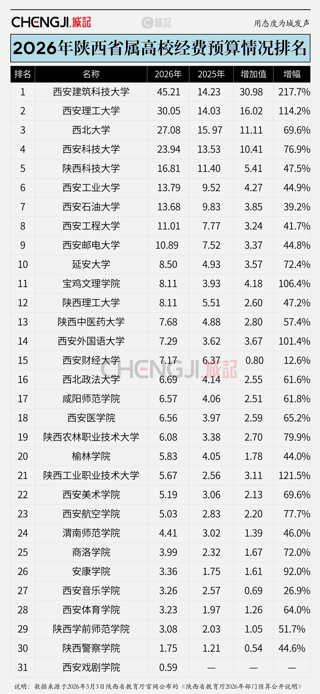 2026年3月3日,陕西省教育厅公布了省属高校2026年经费预算,基本显示出当下高校的建设格局。