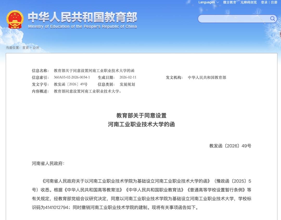 近日,教育部发布关于同意设置河南工业职业技术大学的函,同意以河南工业职业技术学院为基础设立河南工业职业技术大学,同时撤销河南工业职业技术学院的建制。