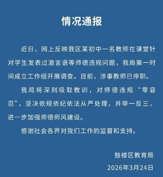 南京市鼓楼区教育局3月24日通报,近日,网上反映鼓楼区某初中一名教师在课堂针对学生发表过激言语等师德违规问题,该局第一时间成立工作组开展调查。目前,涉事教师已停职。鼓楼区教育局将深刻吸取教训,对师德违规“零容忍”,坚决依规依纪依法从严处理,并举一反三,进一步加强师德师风建设。