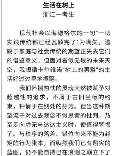 面对铺天盖地的质疑声,浙江省高考作文阅卷大组组长陈建新教授耐心解释:这篇作文的每句话,都紧扣个人人生理想与家庭、社会期待之间的落差与错位来论述。全文逻辑严密,说理充分,没有多余的冗词,所有引用也绝非为了充门面或凑字数。