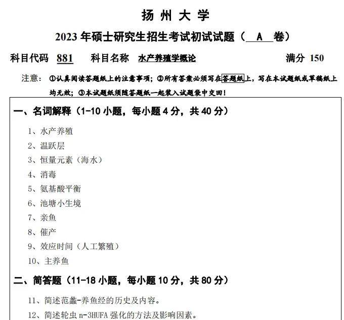 2023年扬州大学881水产养殖学概论考研真题试卷与参考答案