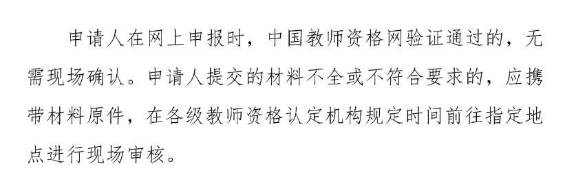 中国教师资格网采用数据比对方式核验申请人提交材料是否符合条件,认定状态为“待认定审批”的申请人,无需到现场提交材料;认定机构留言需至现场审核的申请人,请到各级教师资格认定机构指定地点提交材料进行现场确认。申请人务必关注本人认定状态,及时按照机构指引进行相应事项办理。