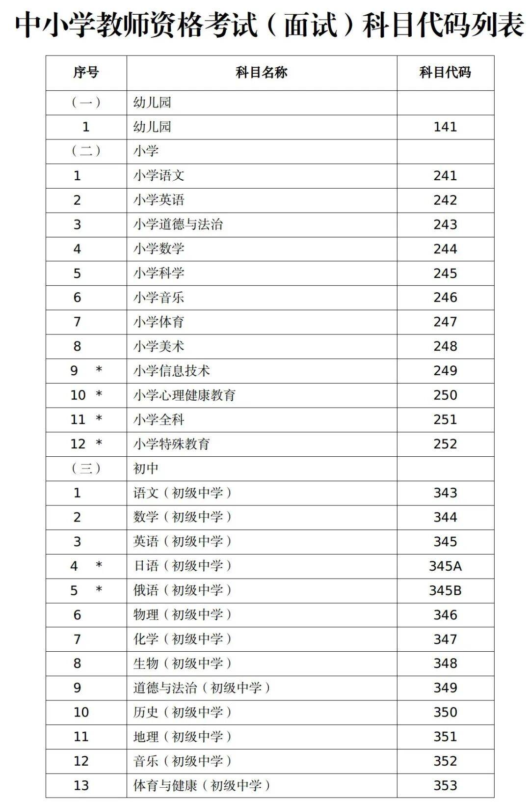 附件1.中小学教师资格考试(面试)科目代码列表