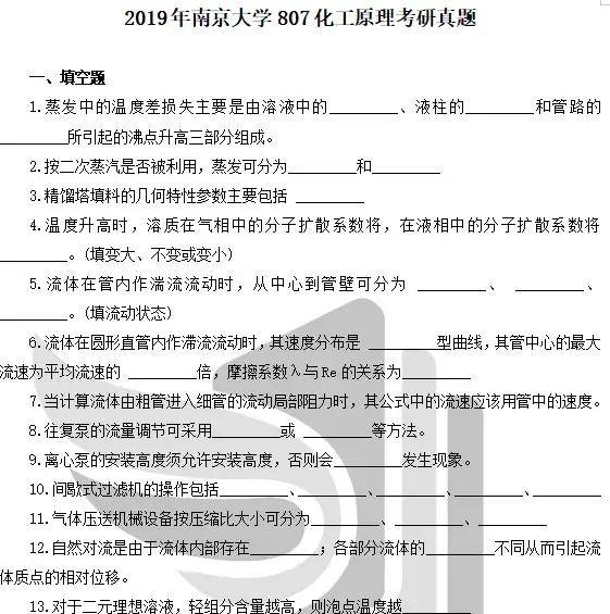 南大807的考查重点基本覆盖参考书目的所有章节,出题风格变化不大,核心知识点也一直没有发生变化。综合来说,化工原理专业课这几年的题型变化不大,主要有四大类题型,填空题测重于对基础知识的考查,复习时应多注意课本上一些细小的问题,在头脑里有一定的记忆即可;选择题测重于对所学适应的较低层次的运用,要求大家会运用所学的原理分析一些简单问题,复习时对于课本上“变化”这类的问题多注意;简答题侧重于对大方向问题的解决,一般是笼统的回答,复习时要抓住课本上“影响因素”这类总是;计算题侧得于对所学知识的灵活运用,每年所考的计算题类型差不多,都可以在课本上找到类似的例题,大家在复习时要注意课本上例题的答题思路,当然公式要记住。