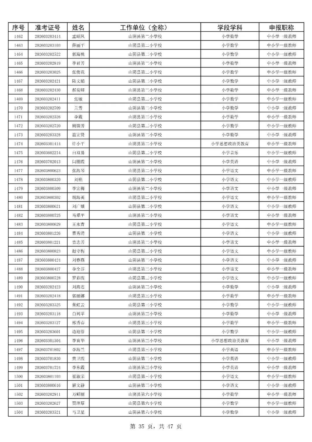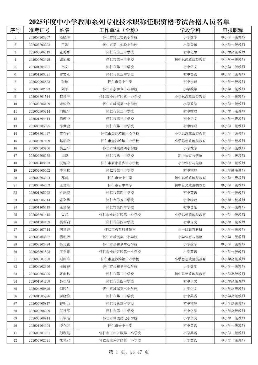 现将2025年度朔州市中小学教师专业技术职称任职资格考试合格人员名单予以公示,共1993人。公示日期2026年4月9日至2026年4月15日,如有意见或问题,公示期间向朔州市人力资源和社会保障局、朔州市教育局职称领导组办公室反映。反映材料要签署个人姓名,写明本人工作单位、通讯地址和联系电话,以便于核实了解情况。