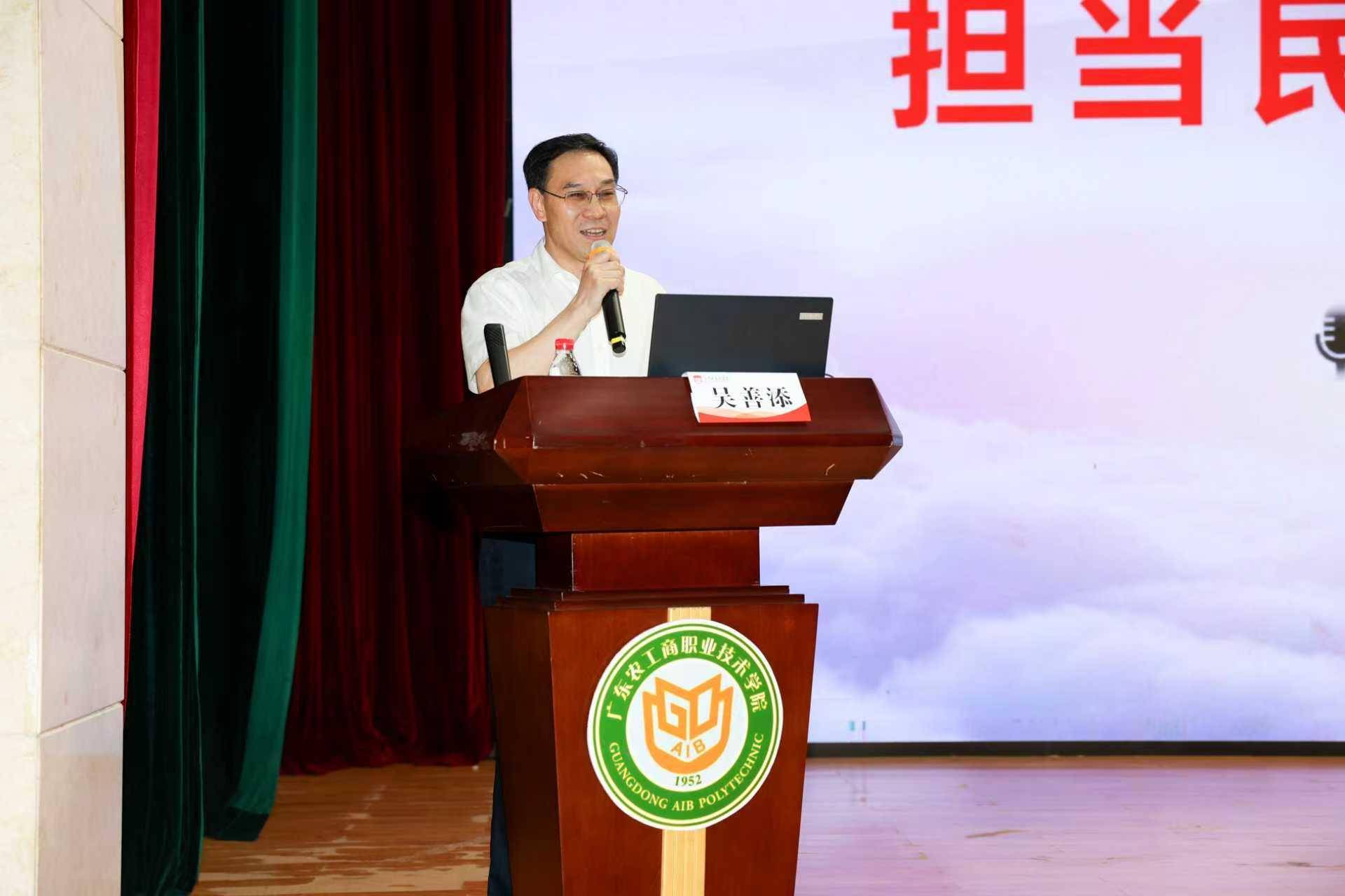 4月9日下午,广东农工商职业技术学院新学期“思政第一课”正式开讲。学校党委书记吴善添以“树立职业教育自信,担当民族复兴大任”为主题为全校师生代表讲授了一堂深刻而富有启迪意义的思政课。