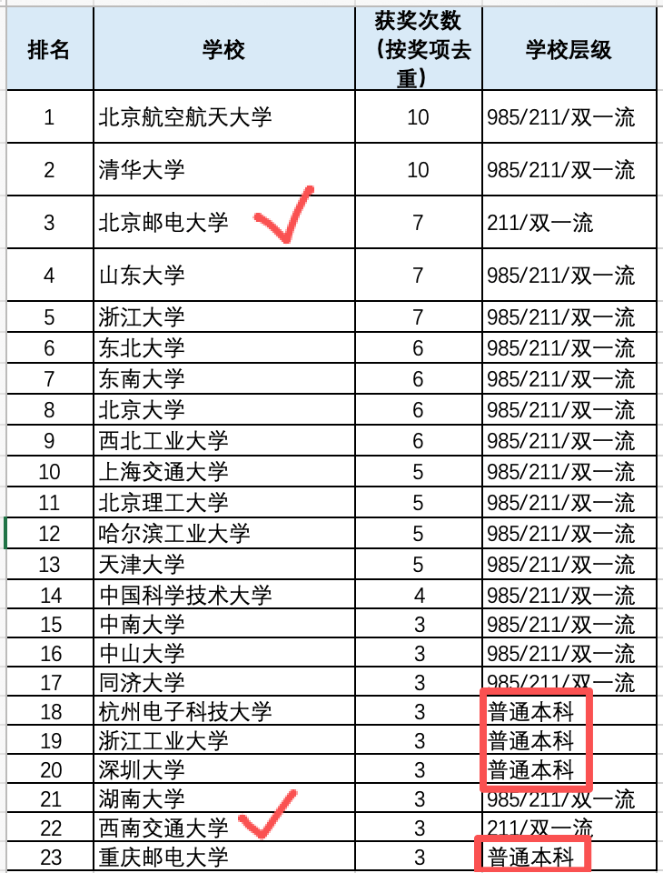 获奖名单中,北邮和西南交大,位于211大学前列,普本双非中,上榜了的除了杭电和重邮之外,深圳大学和浙江工业大学也高票上榜。