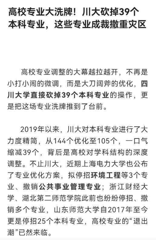 近期四川大学砍掉39个本科专业的消息,在教育圈炸开了锅,这则看似突发的新闻,其实源自教育部今年1月发布的一份专业调整报告。