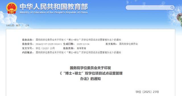 去年底,国务院学位委员会印发《“博士+硕士”双学位项目试点设置管理办法》,提出由试点高校自主设置“博士+硕士”双学位项目,支持项目学生在攻读博士学位期间同时攻读另一个学科专业的硕士学位。