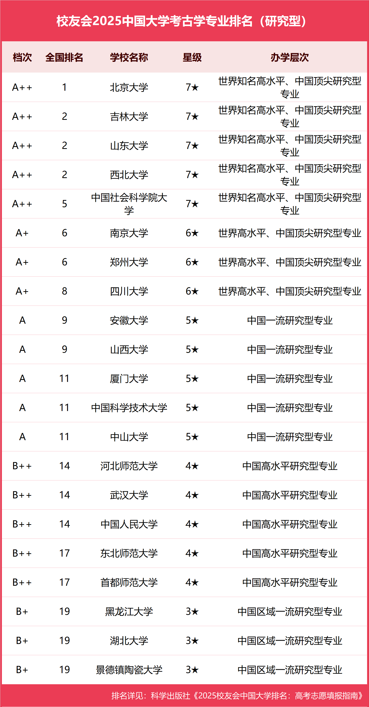 在校友会2025中国大学考古学专业排名(研究型)中,北京大学(7★,A++)水平最高,位居校友会2025中国大学考古学专业排名(研究型)首位。吉林大学(7★,A++)、西北大学(7★,A++)、山东大学(7★,A++)位列第2。中国社会科学院大学(7★,A++)位列第5。郑州大学(6★,A+)、南京大学(6★,A+)位列第6。四川大学(6★,A+)位列第8。山西大学(5★,A)、安徽大学(5★,A)位列第9。