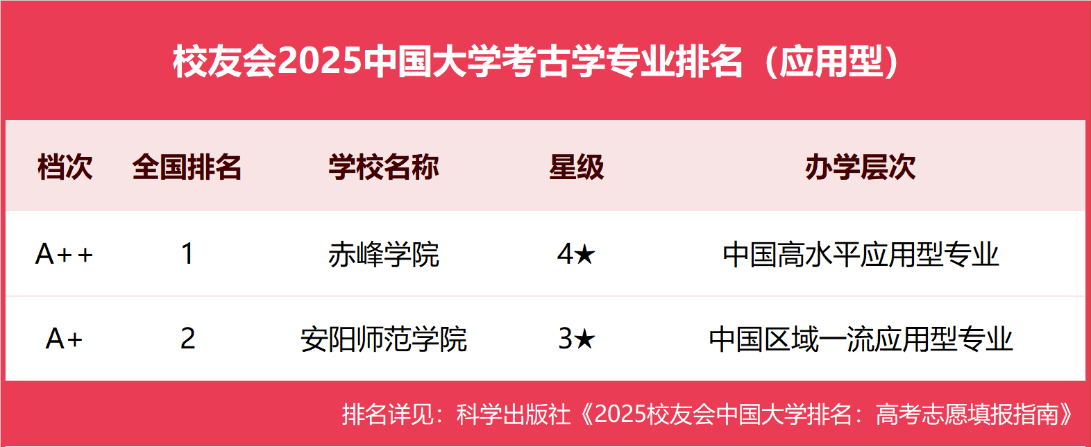 在校友会2025中国大学考古学专业排名(应用型)中,赤峰学院(4★,A++)办学实力最强,最具竞争力,夺得校友会2025中国大学考古学专业排名(应用型)榜首。安阳师范学院(3★,A+)位列第2。