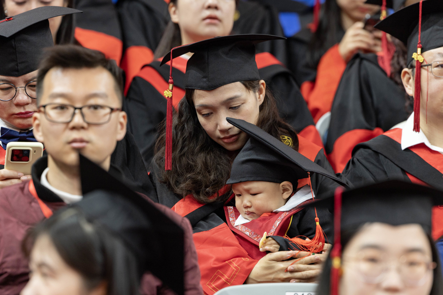 一名毕业生抱着孩子参加典礼。