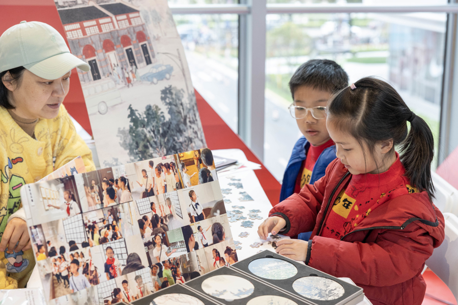 在嘉定嘉亭荟城市生活广场举行的美育市集上,孩子们一起动手玩红色主题拼图。