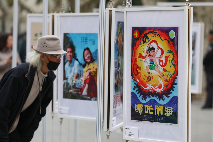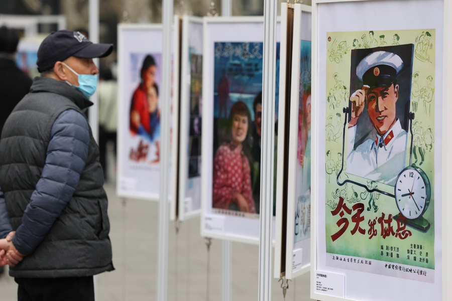 观众在襄阳公园参观中国电影诞辰120周年电影海报展。