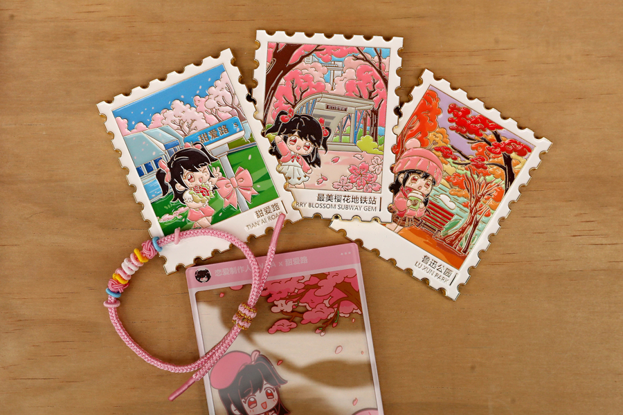 在“春日市集”中,甜爱路&恋爱制作人ANNA的摊位上吸引了不少人的关注。其中,最美樱花地铁站、鲁迅公园、甜爱路专属金属冰箱贴,以及ANNA & 甜爱路限定透卡等销量都很好。